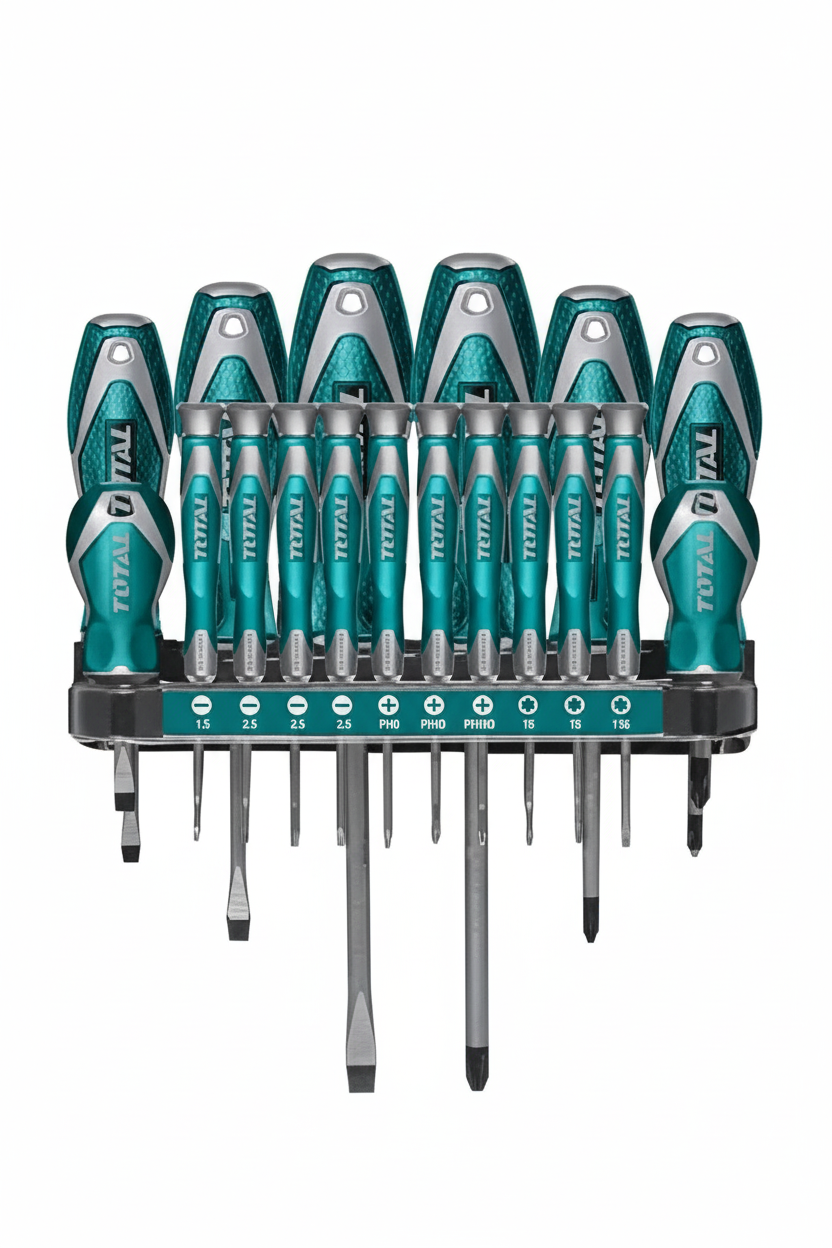 Perfect for both DIY enthusiasts and professionals, the TOTAL 18 PIECE SCREWDRIVER SET is an essential part of any toolbox.