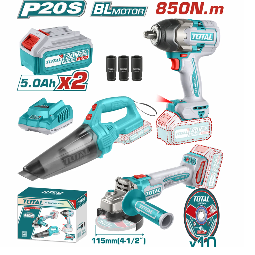TOTAL 3PC CORDLESS COMBO 20V IMPACT WRENCH/ ANGLE GRINDER/ VACUUM CLEANER